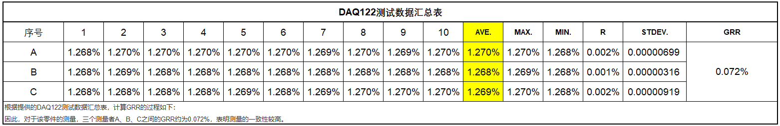 Per garantire che la scheda di acquisizione dati selezionata soddisfi i requisiti, il team ME l'ha testata. L'analisi mostra che la scheda di acquisizione dati selezionata ha un'eccellente stabilità, con un GRR di circa 0,072% tra i tre misuratori A, B e C.
